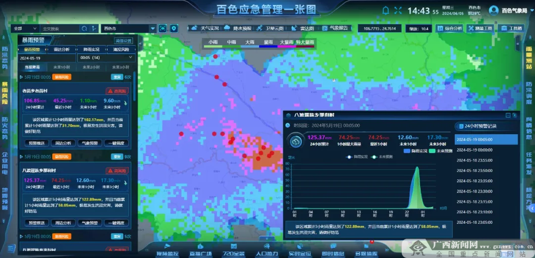 百色市气象局联合市应急管理局落地应用区气象科学研究所研发的“暴雨灾害风险智能预警”系统并建成应急管理一张图。百色市气象局 供图 百色市气象局与市应急管理局于去年4月率先联合落地应用该系统,构建起“百色市暴雨风险智能预警调度”系统,并部署应用于防汛、应急等相关部门。通过该系统,应急指挥调度部门实现对中、高风险地区防汛短临预警“测、判、调”一体化,并能一键调度市、县、乡、村、屯五级负责人和网格员,打通了应急指挥的“最后一公里”。 |