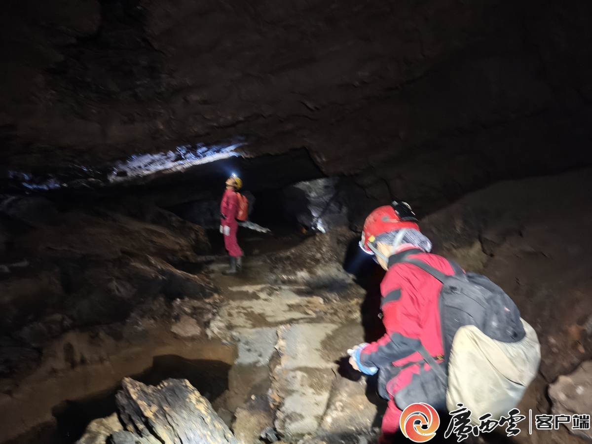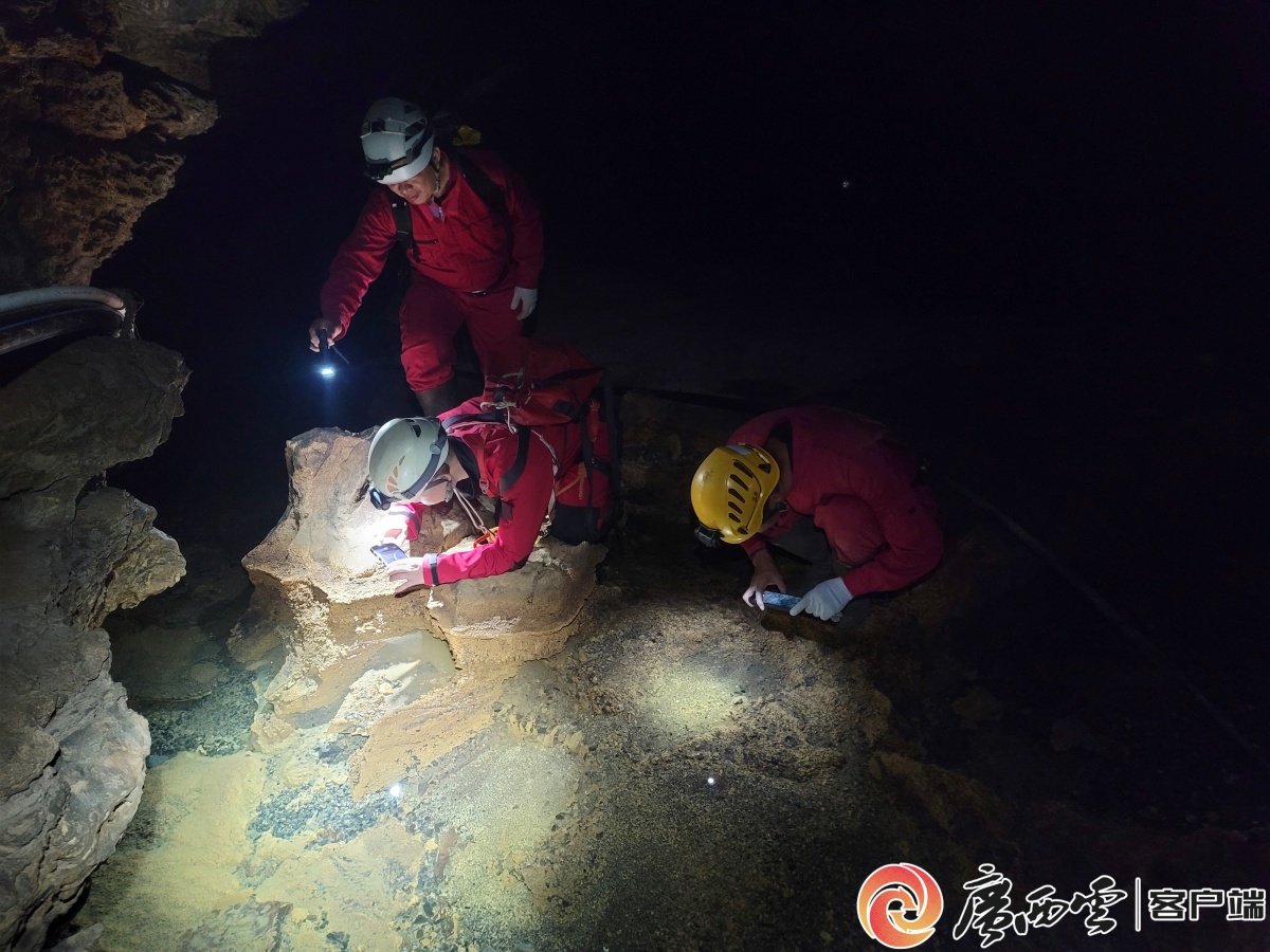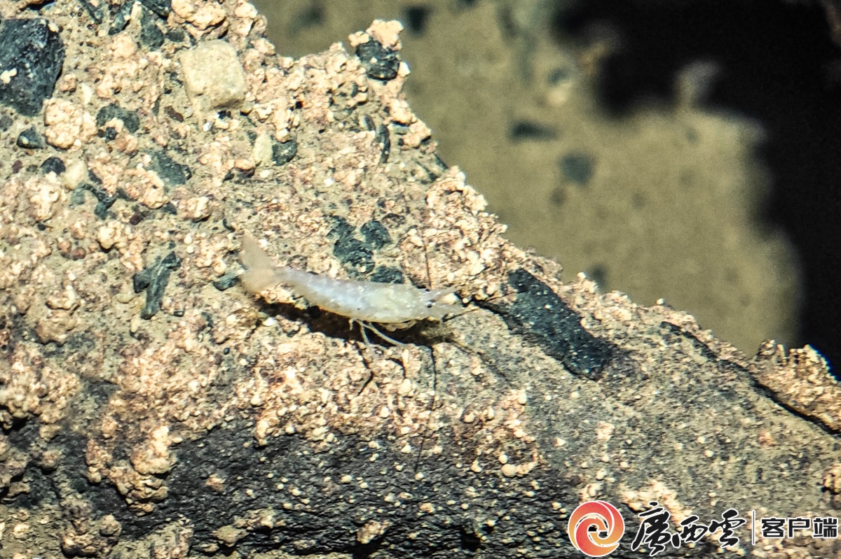 讨论探险方案。莫自强 摄 12月4日至5日上午,广西岩心探险队进到洞内,勘测地形,架设SRT线路,准备向地下深处挺进。 岩心探险队队长张敏智和队员蒙国勇,均是经验丰富的洞穴探险者。随队的洞穴女摄影师向航,也有20多年洞穴探险经验,她将全程跟拍,为今后的科考、开发提供可靠的资料。 3人均多次参加国内天坑洞穴科考活动。其中,2012-2013年,向航负责桂林申报世界自然遗产的图片拍摄并呈报联合国教科文组织,2014年桂林申遗成功;2024年,向航作为受访的摄影师,参与了央视、广西卫视联合摄制系列人文自然纪录片《漓江》的拍摄。 洞穴里发现盲虾。向航 摄